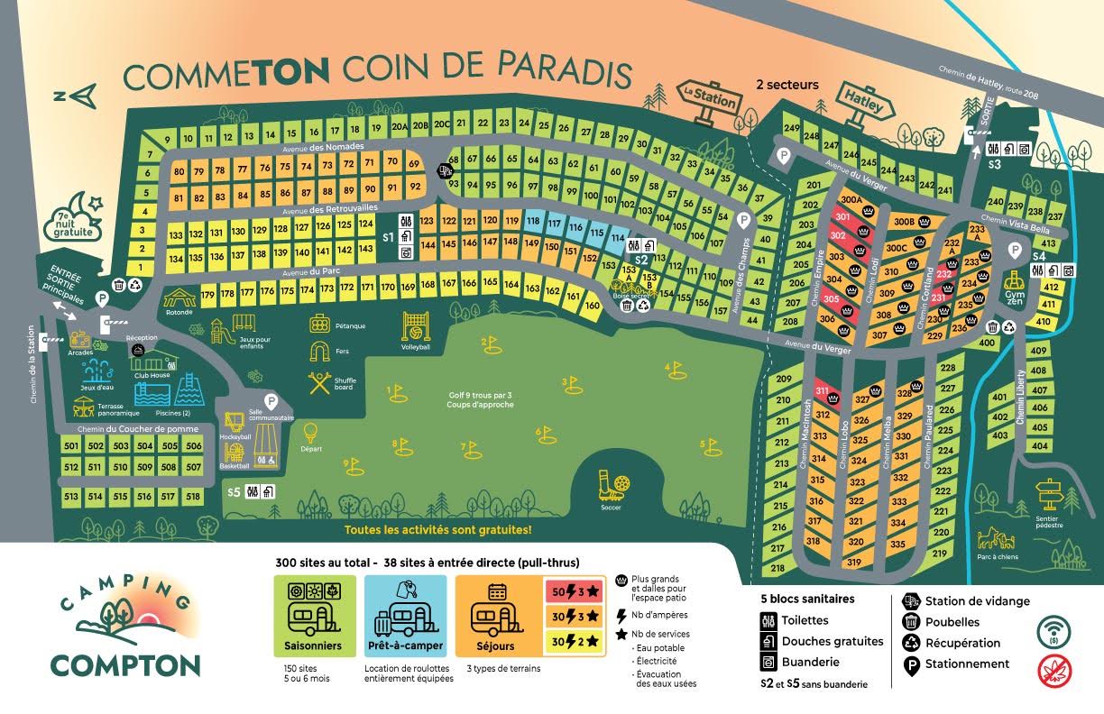 Les dallettes intégrées ajoutent une touche pratique et esthétique qui facilite l'aménagement de votre coin repas ou de détente. L'environnement calme et bien organisé du secteur Hatley en fait un lieu parfait pour se retrouver, partager des moments mémorables et savourer l'art de camper avec une note d'élégance.